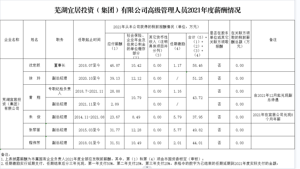 蕪湖宜居投資(集團(tuán))有限公司高級(jí)管理人員2021年度薪酬情況
